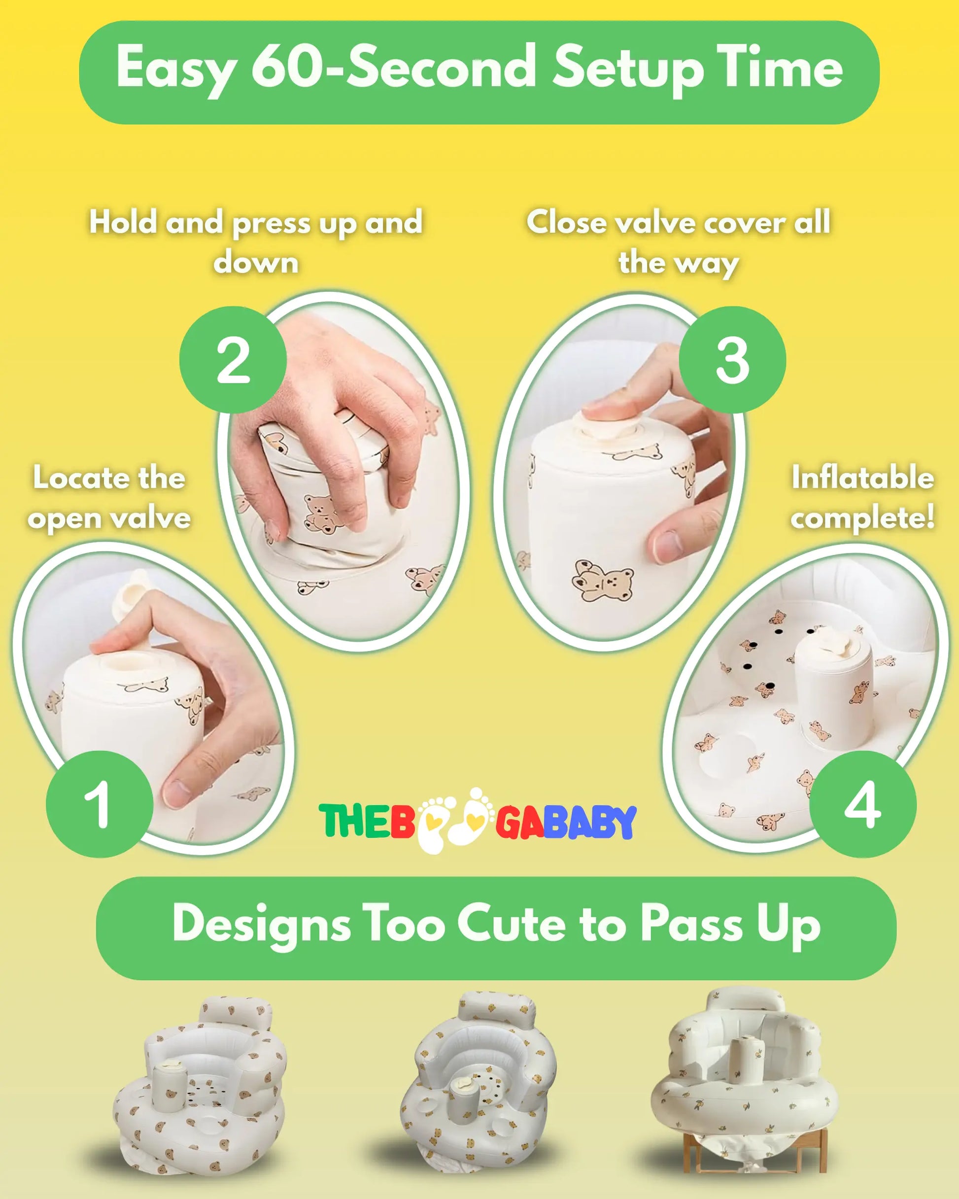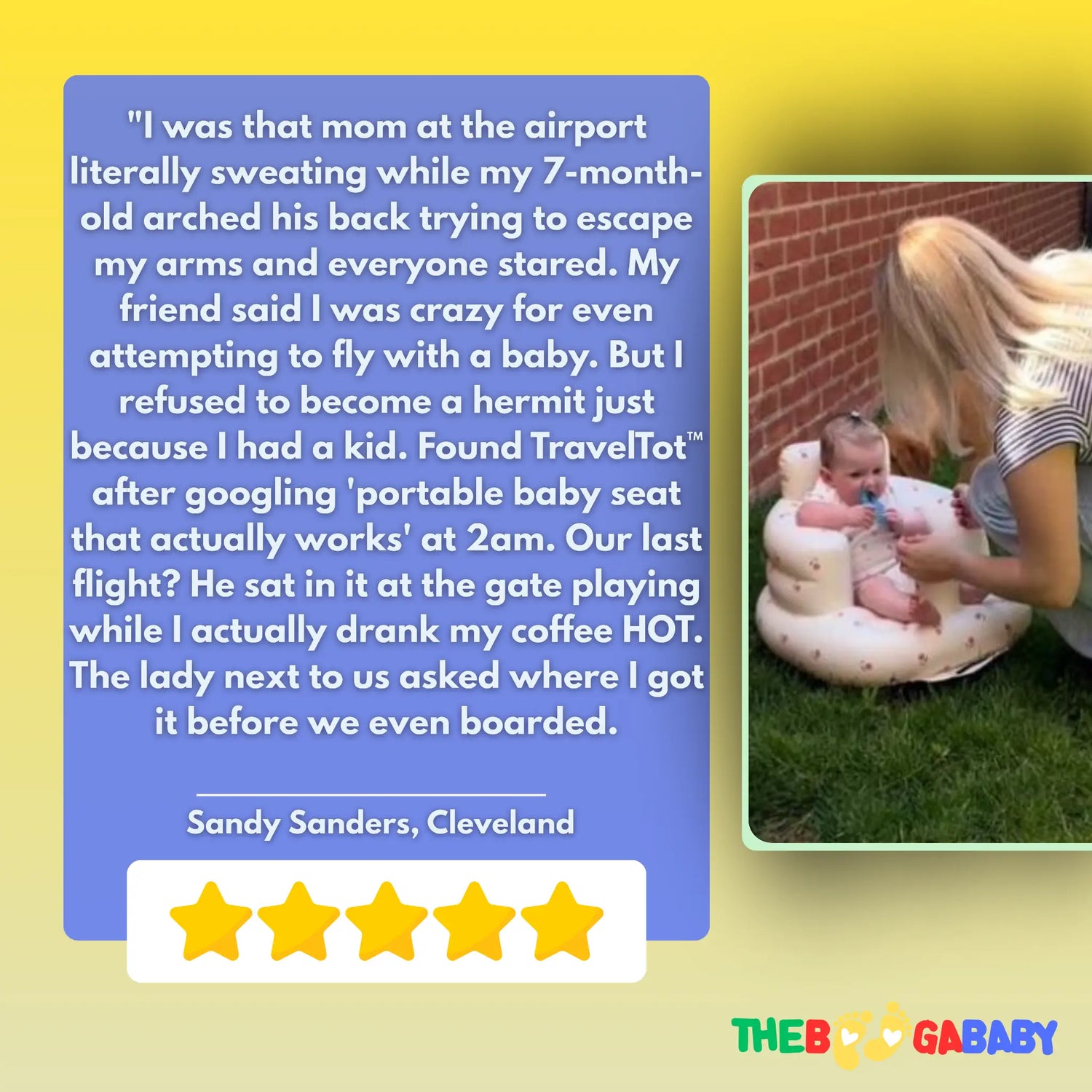 Absolutely safe when used properly. TravelTot™ is made from BPA-free, non-toxic materials and designed for floor-use only with constant supervision (like any baby seat). The wide base and suction cup grips prevent tipping. Unlike Bumbo (which has had safety recalls) or DIY pillow methods, TravelTot™ has built-in stability features. Always use with babies 4-12 months who can hold their head up steadily, never on elevated surfaces, and always within arm's reach.